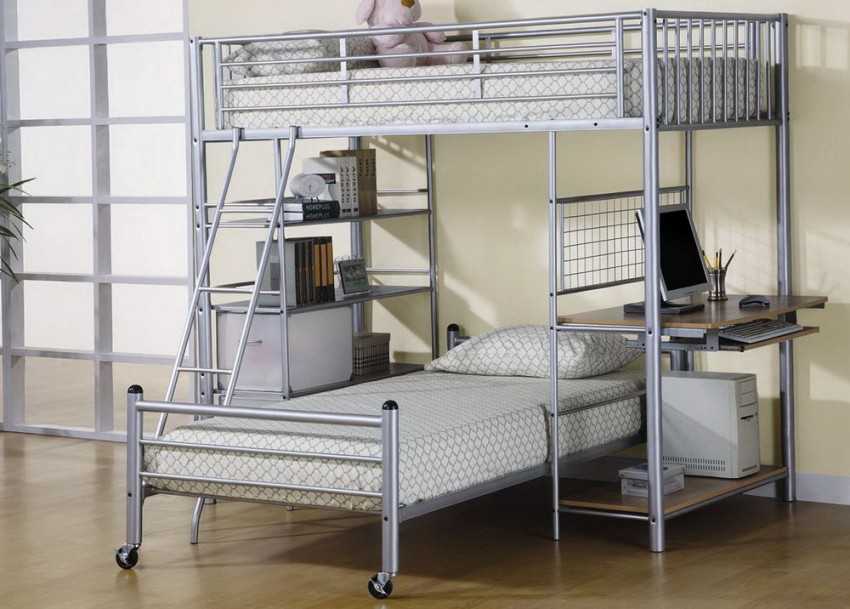 - Комбинированные модели, представленные одним спальным местом и другими предметами мебели нижнего яруса – письменным или компьютерным столом, мягким креслом, диваном, комодом или шкафом.