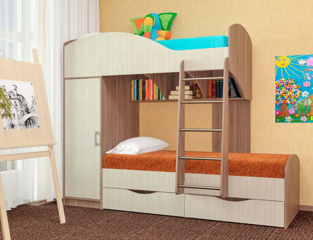 - двухъярусная кровать со шкафом, который находится сбоку;
