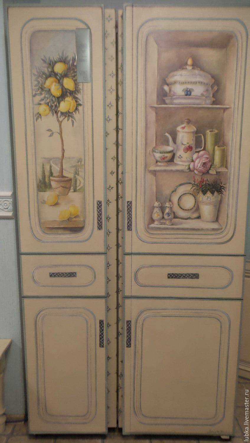 А вот такой холодильник отлично впишется в классику. Здесь также придется много порисовать красками. Шкаф может быть любым, в т.ч. и в тон основной мебели.