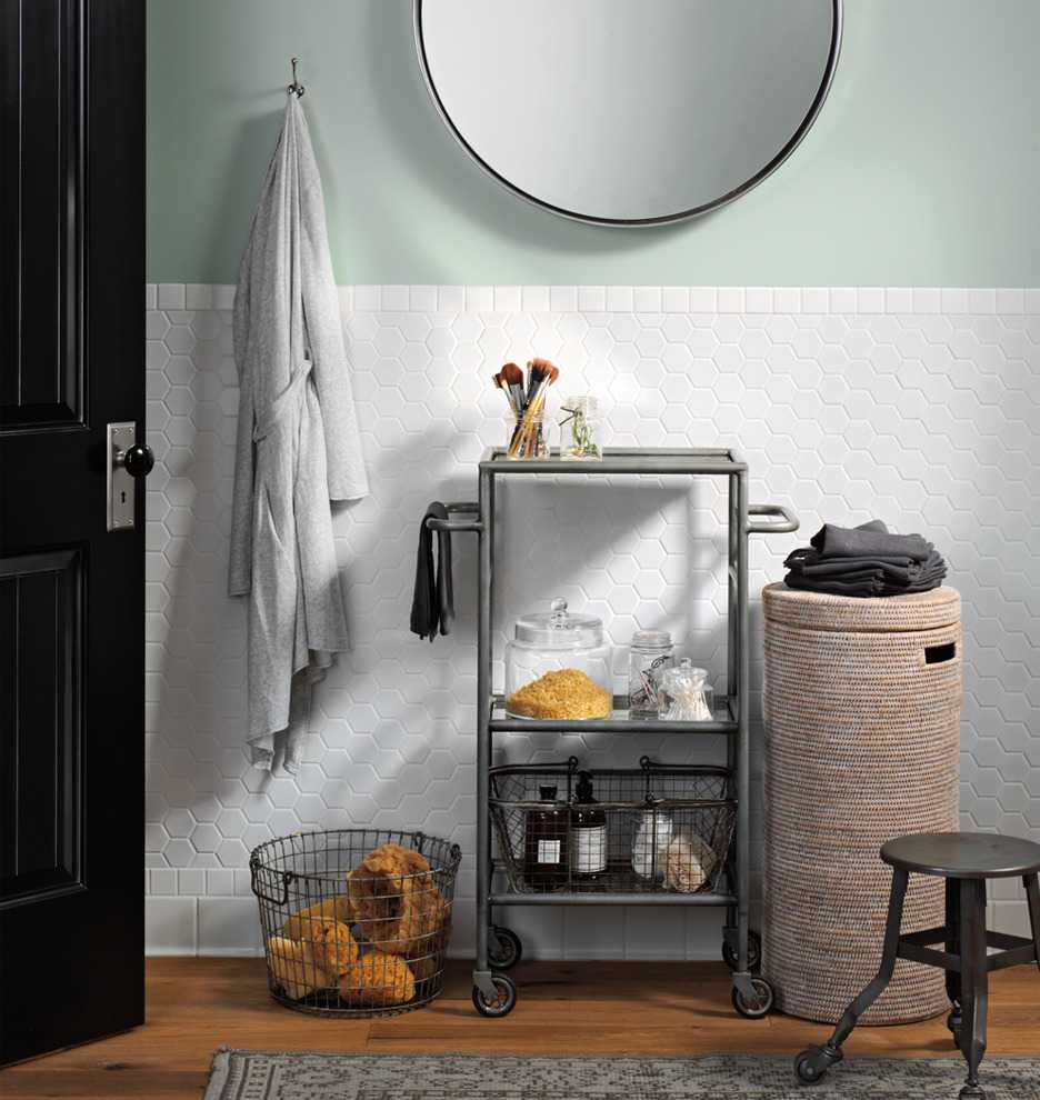 Еще один способ экономить пространство – использовать стены, не занимая места на полу. Ванная не выглядит захламленной, под ногами ничего не мешается, а белье надежно и аккуратно убрано. Чтобы не занимать стену большой конструкцией, которая будет выглядеть громоздко, есть отличный дизайнерский ход.