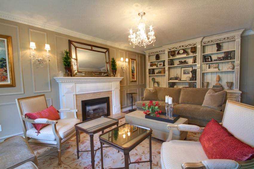 - в комнатах отдыха (спальне, гостиной, библиотеке) устанавливается камин с декоративной полкой;