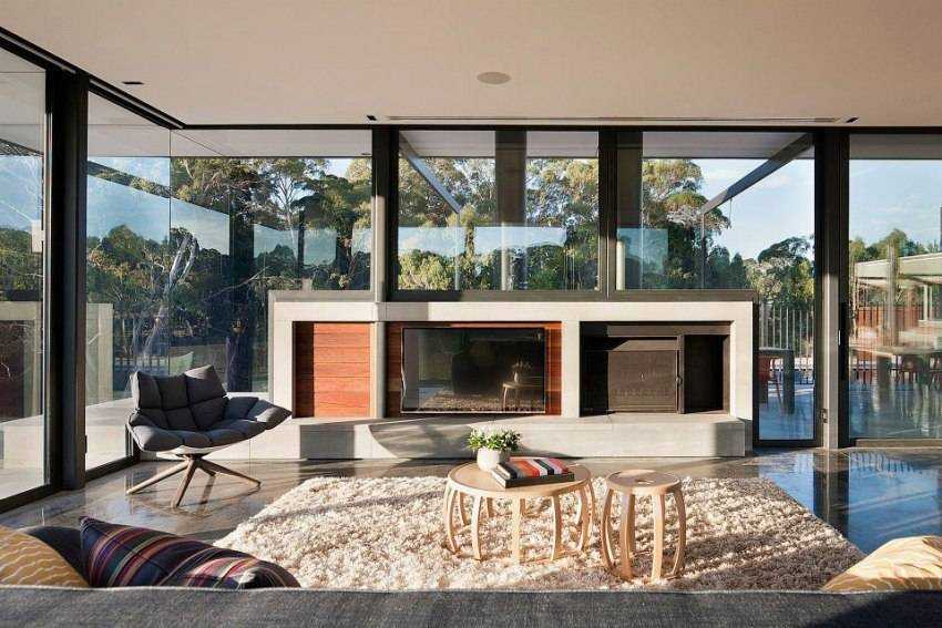 Стекло и бетон. Комбинацию этих материалов нередко можно увидеть в оформлении дома в современном стиле. Большие панорамные окна дают возможность наслаждаться окружающей природой, пропускают в помещение много света и при этом смотрятся стильно