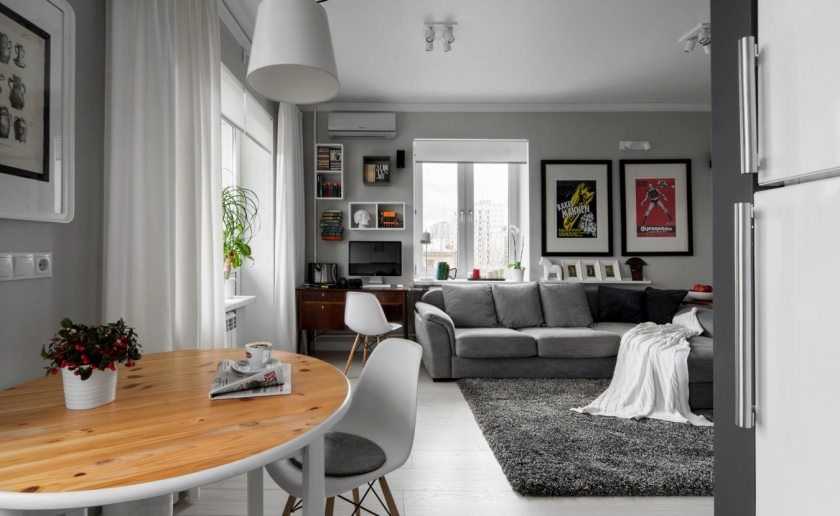 Для размещения всего необходимого в маленькой квартире следует совместить зоны с разными функциями. Обычно комбинируют гостиную и спальную зону.