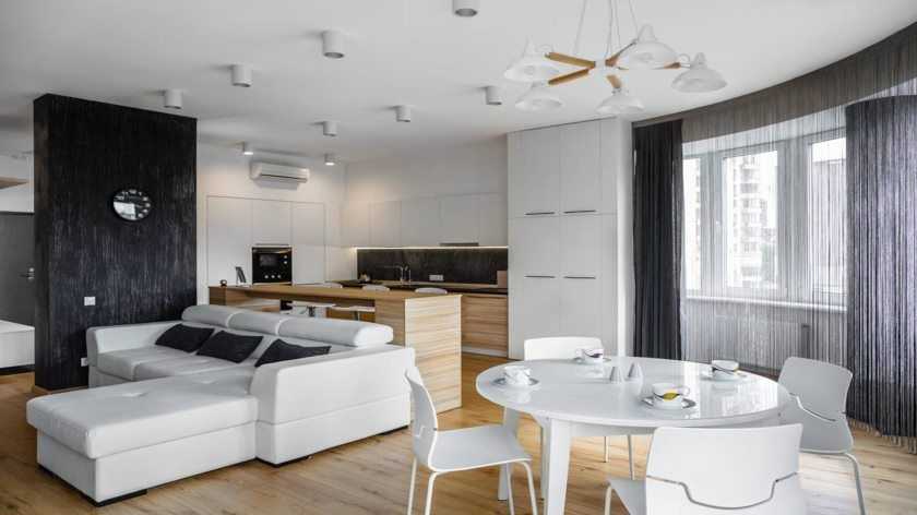 Современная гостиная, совмещенная со столовой и зоной кухни