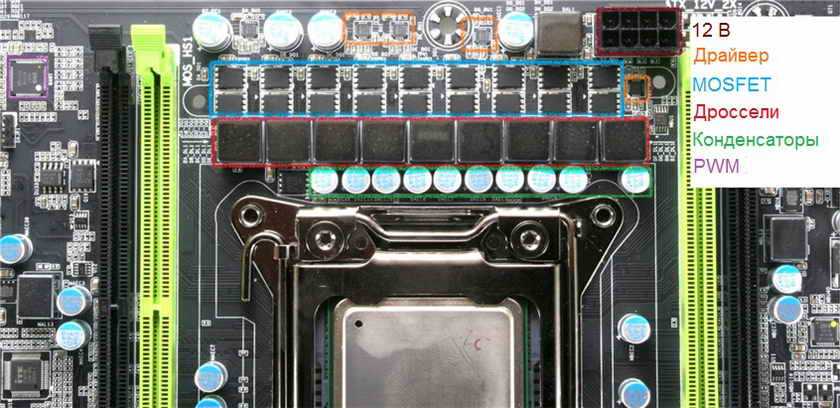 Чтобы знать, о чем собственно речь, давайте обратимся к фотографии материнской платы, вернее, к части ее, расположенной возле процессорного сокета. Вот типичная картина того, что можно увидеть на любой плате.