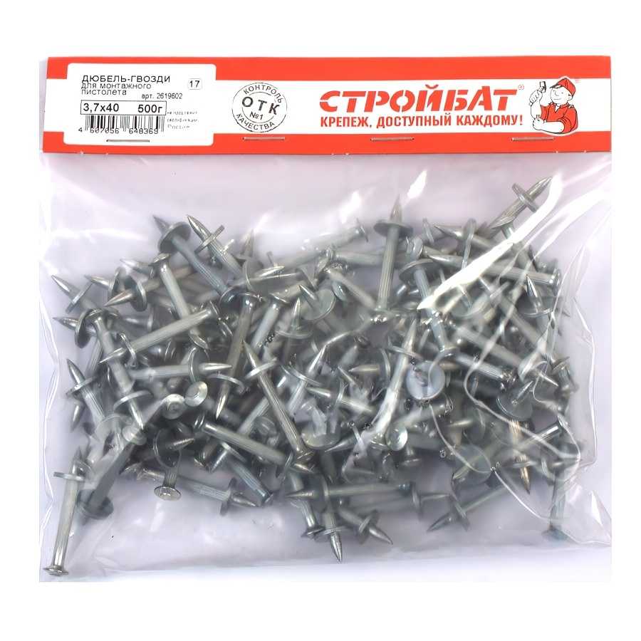 Дюбель-гвоздь такого типа нашел свое применение в креплении металлических конструкций к стенам из бетона, натурального камня и кирпича. Чаще всего используется монтажный пистолет с этими крепежными элементами для установки козырьков над входом и балконами. Длина таких гвоздей от 30 до 80 мм, сечение – 4,5 и 3,7 мм. Выполнены они из стали с цинковым покрытием.