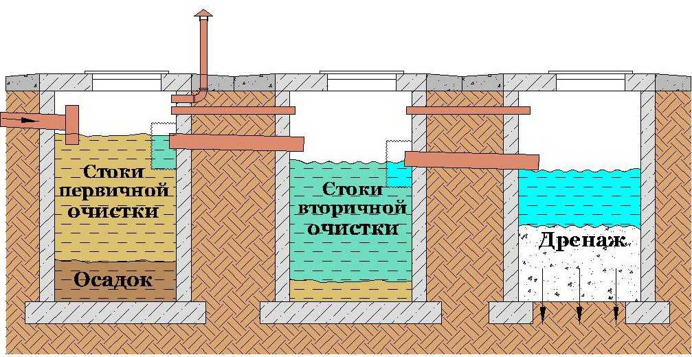 Для достижения необходимого результата можно использовать типовую схему с более сложным строением. Конструкция предусматривает установку герметичной емкости. Материалом для нее может послужить бетон или пластик. Эта емкость подлежит разделению на камеры, предназначенные для подачи стоковых вод и отвода очищенной жидкости.