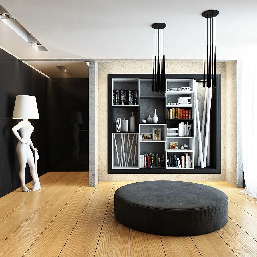 Продумайте систему хранения заранее: учтите каждый предмет, который может храниться на полках стеллажа, избавляя пространство квартиры (дома) от ощущения беспорядка.