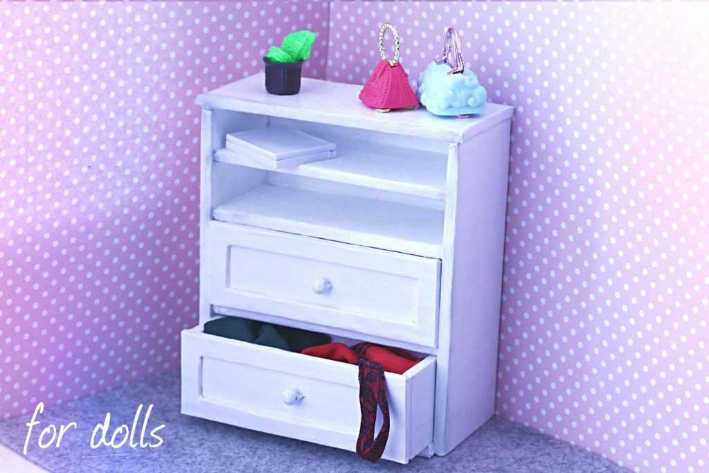 Когда изготавливается кукольная мебель из спичечных коробков своими руками, никак не обойтись без комода. Причем, он подойдет не только для игры — его можно использовать для хранения заколок и бижутерии.