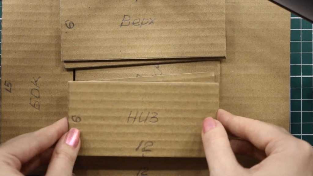 Вырезается 5 деталей из картона: прямоугольная для дна и 4 в качестве стенок. Большая по размерам часть легко заменяется 2 маленькими, которые склеиваются посередине.