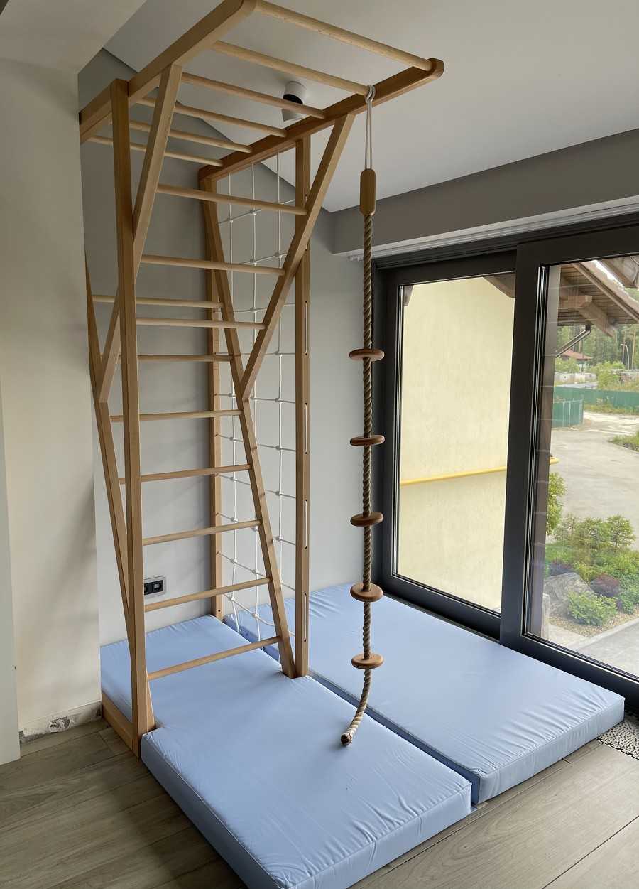 Веревочная лестница – массирует ступни, помогает развить координацию движений и ловкость, так как подниматься/спускаться по веревочной лестнице не так-то просто. К тому же, она намного интереснее шведской стенки.
