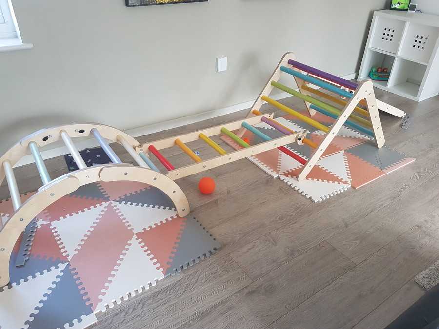 Треугольник Пиклер с горкой и радуга-качалка образуют отличное пространство для игр: малыши могут прятаться под ними и лазать, кататься и придумывать множество полезных для развития движений занятий.