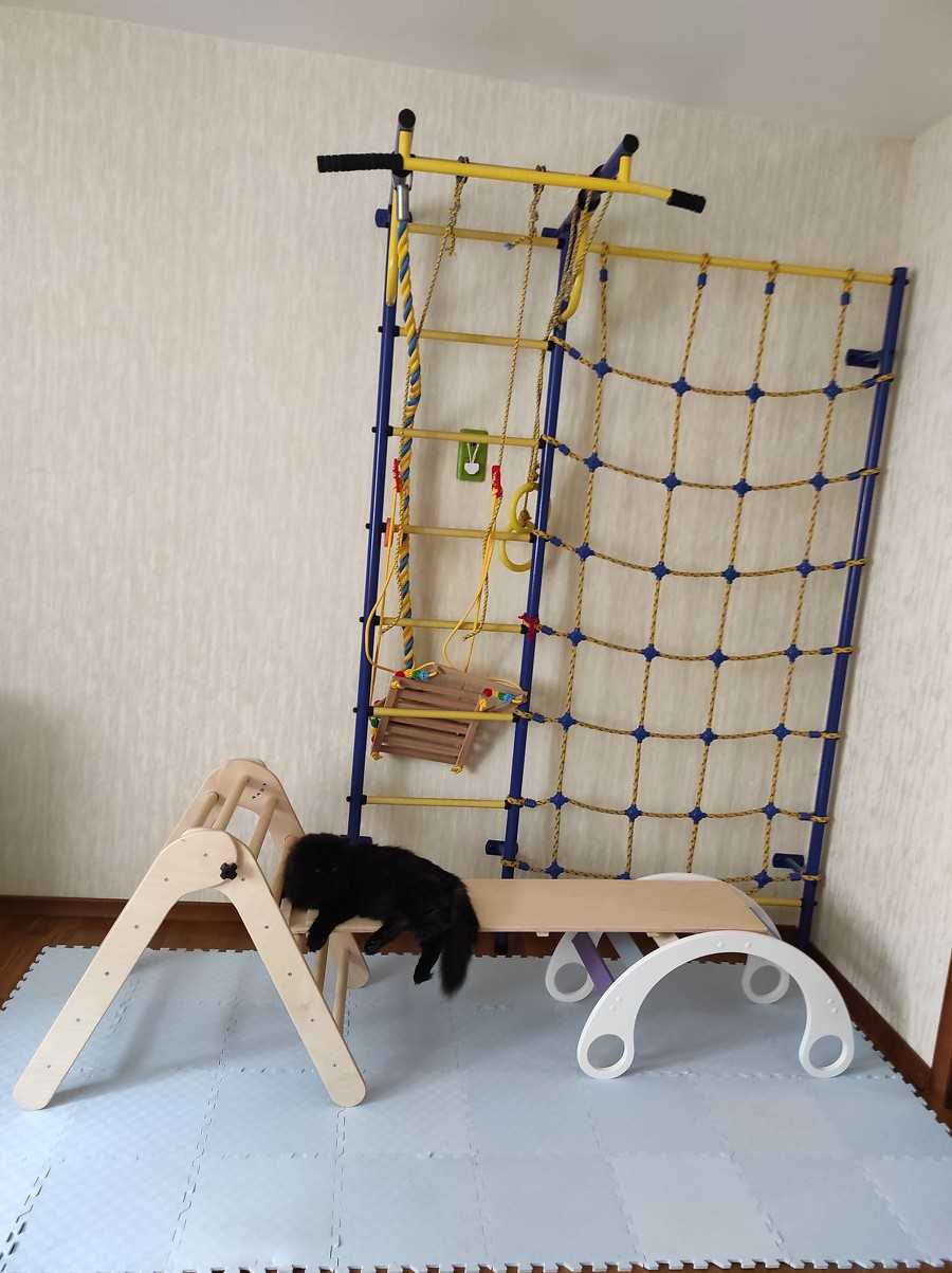 Сейчас и треугольник, и балансир используются как тоннели, в которые можно заползать, а через перекладину интересно переползать или забираться на неё по балансиру. Шведская стенка осталась от прошлых владельцев квартиры, но она пригодится ребёнку довольно скоро.
