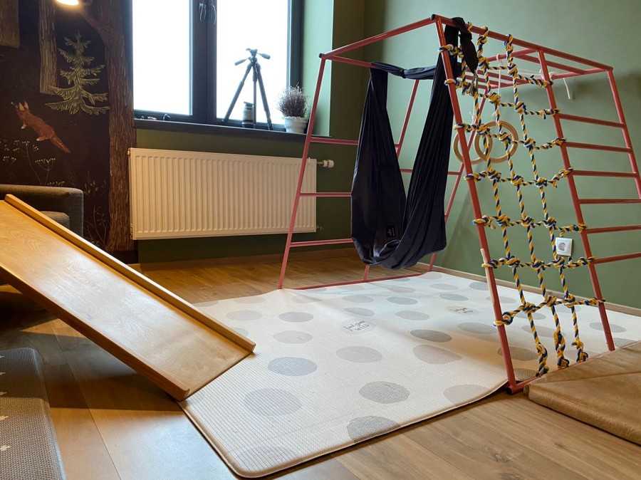 1 год 1 месяц. Когда ребёнок учился вставать, Надежда поставила треугольник Пиклер с горкой-перекладиной, добавила балансир.