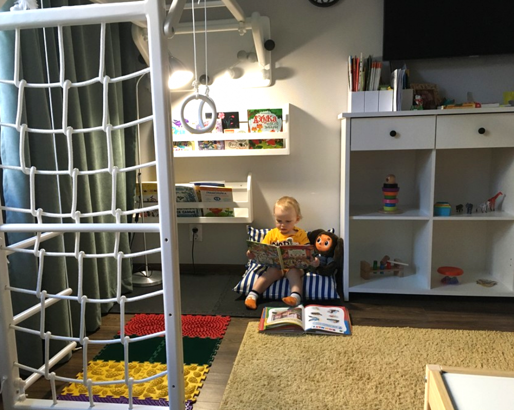 2 года. Елена для своего сына выбрала спорткомплекс «Тёма» от Baby-Champion. Ребёнок начал сразу забираться на сетку и горку. Возле комплекса мама обустроила уголок для чтения, чтобы вечером, после активных игр, малышу было проще отвлечься и успокоиться.