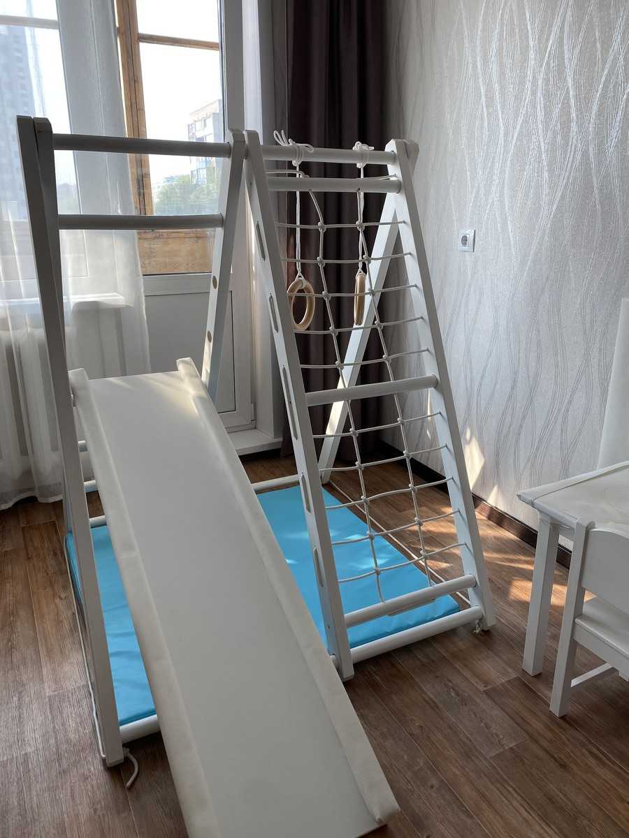 Екатерина для своей дочери Клары выбрала спортивный комплекс «Пирамида». Вместо обычных деревянных качелей мама повесила гамак: он мягкий, лёгкий, безопасен для малышки и создаёт простор для творчества. Ещё возле кресла получилась отличная горка.