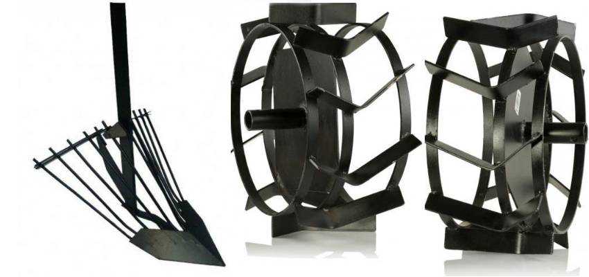 - грунтозацепы – устанавливаются в качестве колес мотоблока и используются для более глубокого вхождения агрегата в землю. Различаются по диаметру, ширине и весу, могут использоваться для окучивания участка;