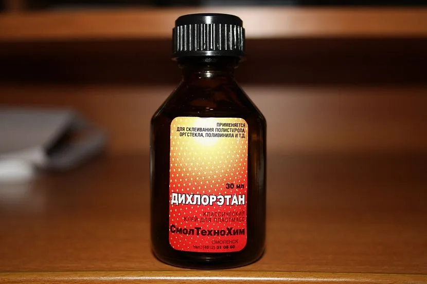 Является эффективным веществом, если отсутствует целевой клей для работы. Его можно приобрести, где продают комплектующие для радиоэлектроники. Дихлорэтан довольно быстро растворяет склеиваемый материал, но и быстро испаряется.