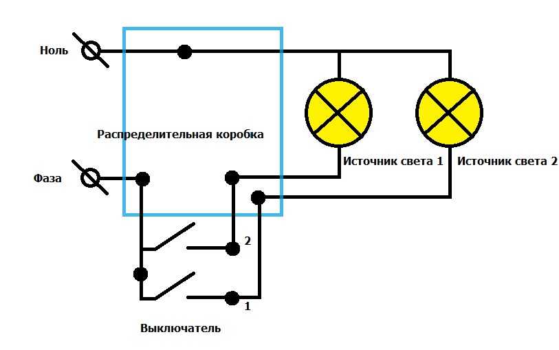 Нулевой провод рабочий ноль к потребителям выводится из распределительной коробки, и не проходит через выключатель. Схема подключения двойного выключателя Три варианта схем — все одинаковые по функциям Двухклавишный выключатель в своих квартирах используют для подключения люстры на несколько лампочек или точечных светильников на потолке.