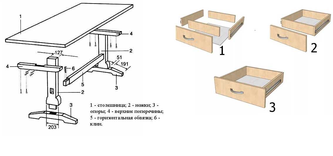 Стандартная схема сборки кухонного стола с выдвижным ящиком.