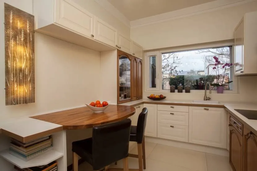 Дизайнеры кухонной мебели утверждают, что для маленькой кухни не подходят круглые и раздвижные столы, а складные и откидные достаточно эргономичны, чтобы их устанавливать в помещениях менее 7 м².