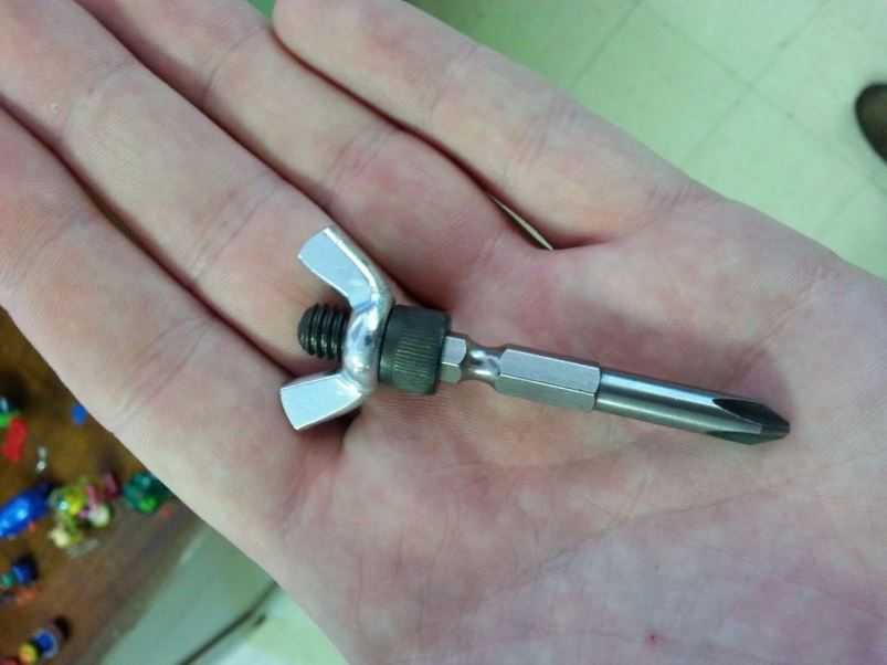Еще проще изготовить маленькую отвертку из металлического мебельного шканта и гайки-барашек. Биту можно вставить любую. Чтобы инструмент надежно работал при вращении против часовой стрелки, резьбу на гайке нужно обезжирить и смазать краской еще до сборки.