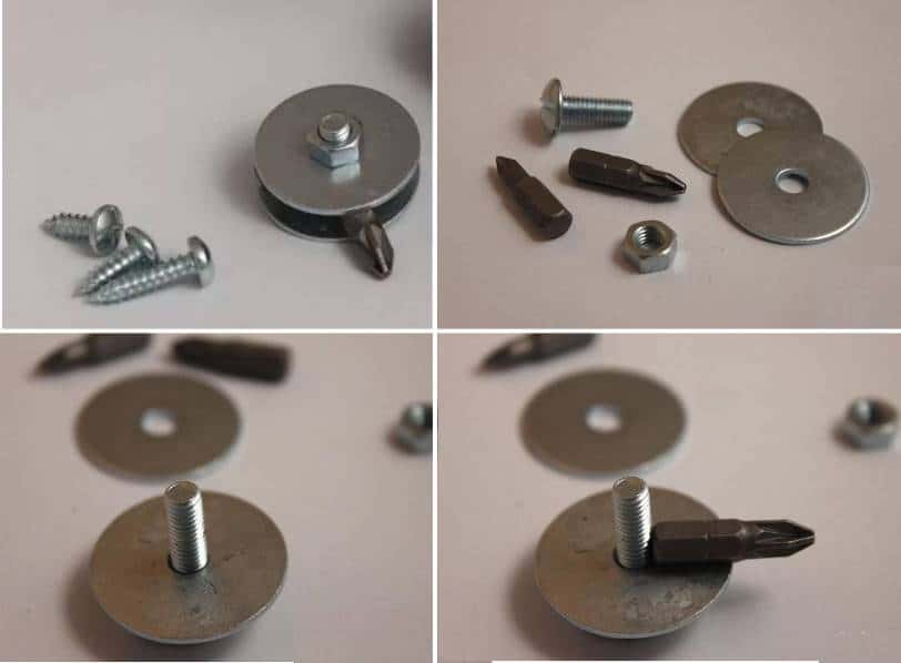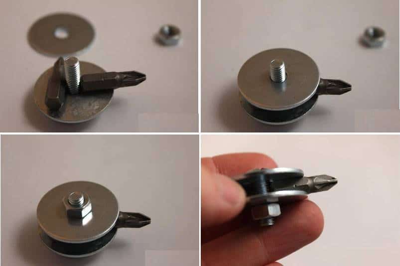 Отвертку собирают в соответствии со схемой на фото. Вторая бита обеспечивает надежную фиксацию шайб в параллельных плоскостях.