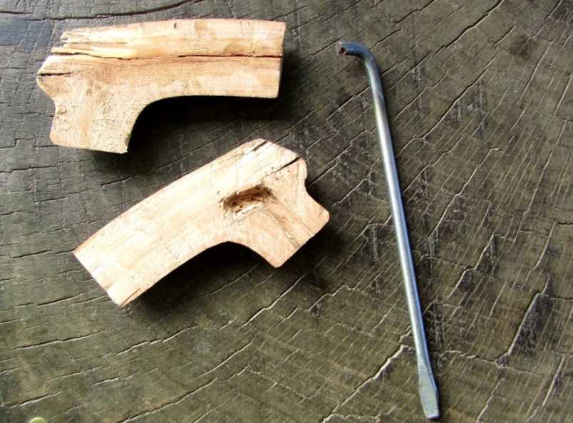Вовсе не сложно изготовить деревянную державку для пистолетной отвертки. Для этого нужно подобрать подходящий сучок из бука, дуба или березы и вырезать из него заготовку соответствующей формы. Стержень отвертки необходимо изогнуть под углом 90 градусов.