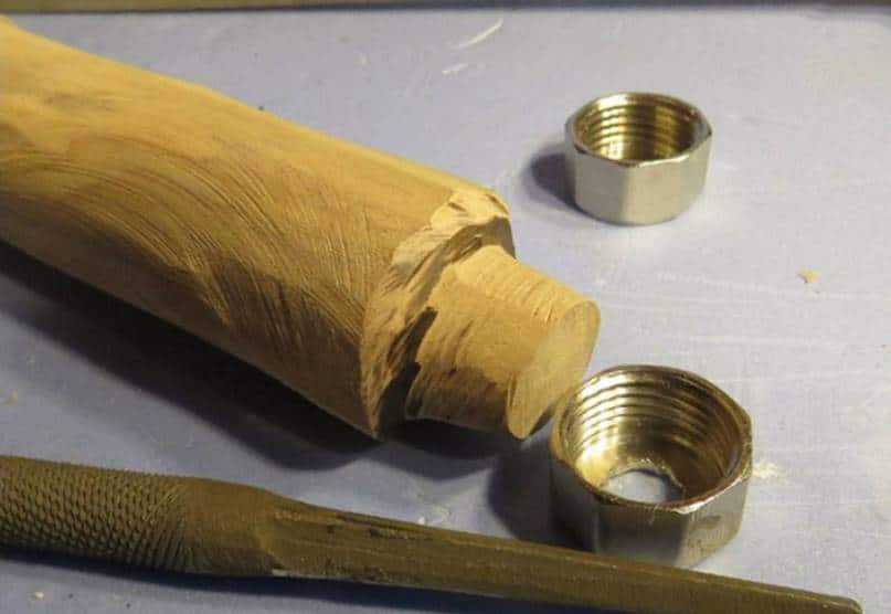 Во-первых, в качестве упрочняющего кольца удобнее использовать латунную заглушку для труб. В ней следует просверлить отверстие для стержня инструмента, а затем навернуть на выступ рукоятки.