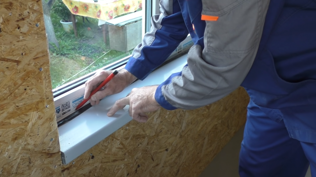 Устанавливаем подоконник на место и с помощью карандаша наносим метки, на которые будем ориентироваться при установке конструкции;
