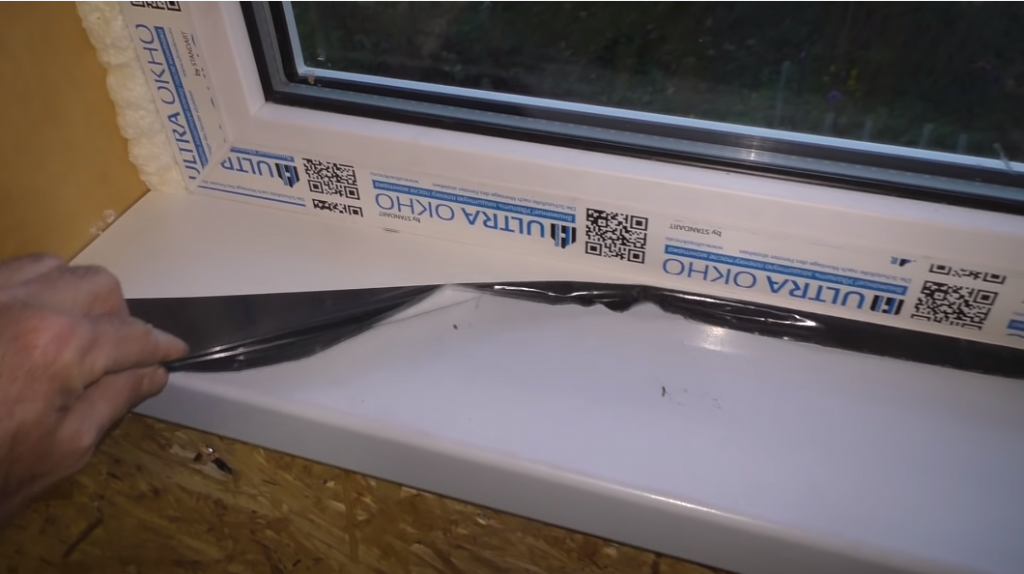 Шаг 4. Периметр окна проклеивается специальной пароизоляционной лентой, причем снизу используется материал с фольгированной поверхностью.