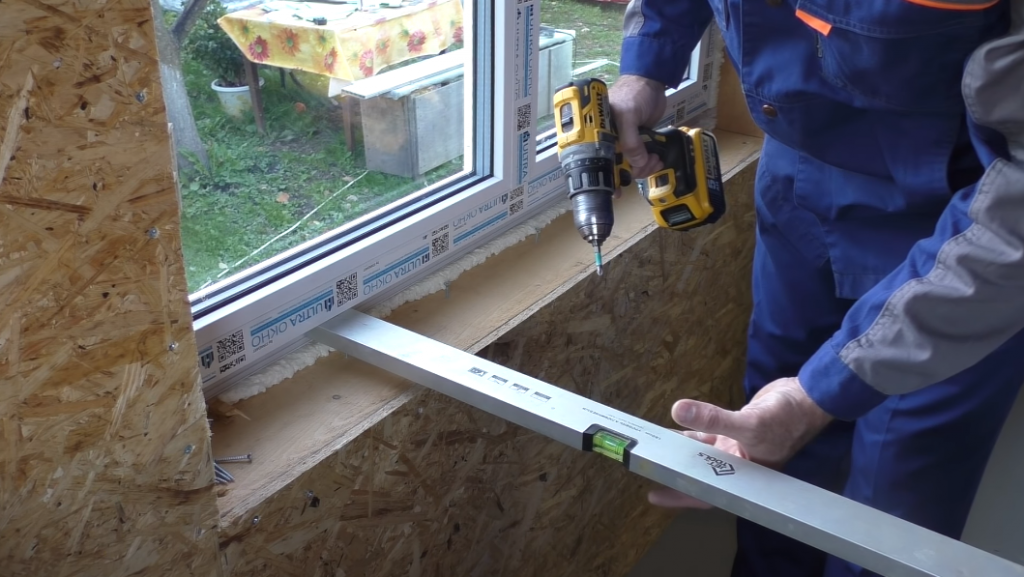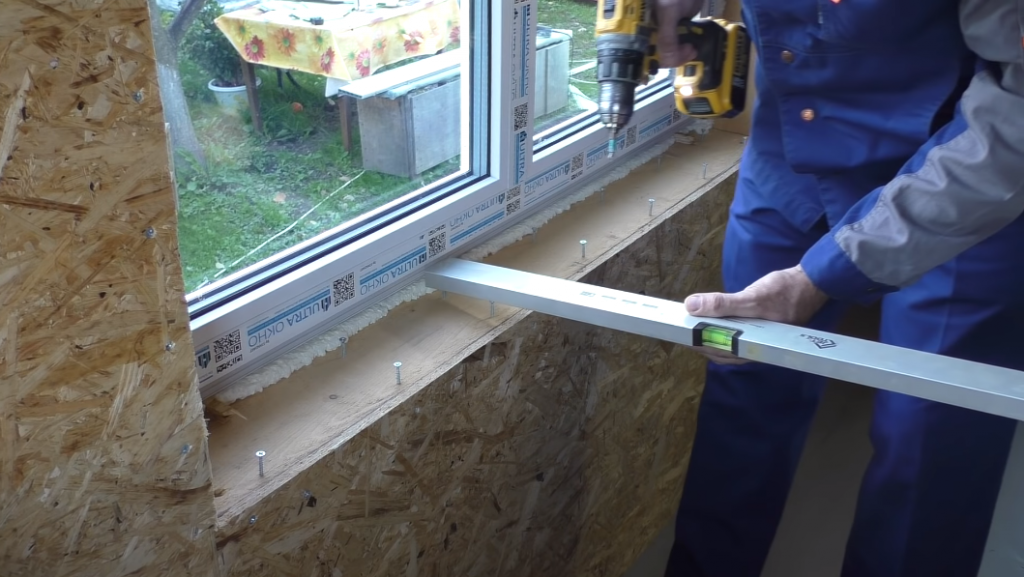 - Под подоконник подкладываются деревянные клинья, и изделие выравнивается с помощью строительного уровня.