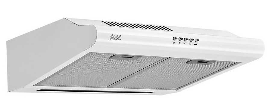 - MAUNFELD VS Light (C) 60 белый – второе место. Вытяжка имеет два режима работы и кнопочную панель управления. В недорогой модели установлен один двигатель мощностью 160 Вт. Уровень шума агрегата – 48 дБ, производительность – 520 м3/ч.