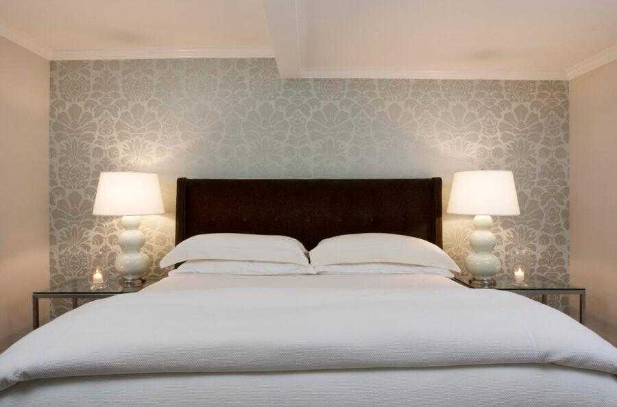 На фото отделка стен в спальне выполнена в одной цветовой гамме флизелиновыми обоями-компаньонами. Покрытия отличаются рисунком и фактурой.