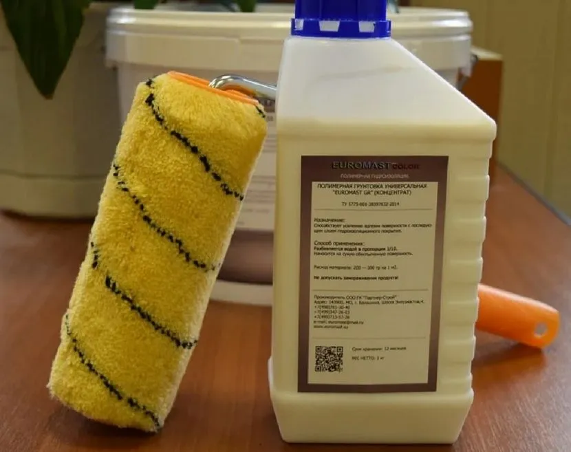 - Первый слой грунта наносим после четырехкратного разведения водой. Для нанесения используем валик или широкую кисть.