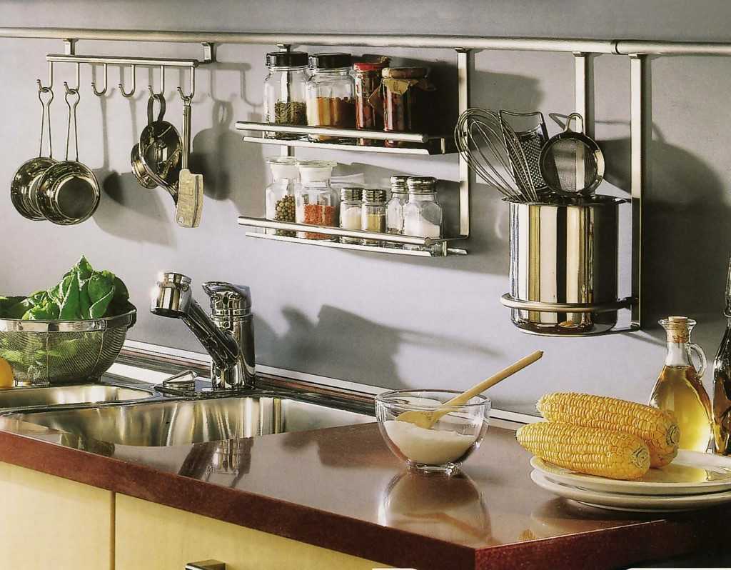 Рейлинги над плитой предназначены для хранения прихваток и зажигалок. На рейлинговых системах над мойкой часто хранят стаканы, чашки и пр. Над столешницей удобны планки с крючками для ножей, половников, шумовок и т. д. Рядом с плитой можно повесить небольшие планки с полочкой для специй. Системы хранения для полотенец и других быстро пачкающихся предметов не стоит размещать поблизости от рабочей зоны, особенно рядом с варочной поверхностью.