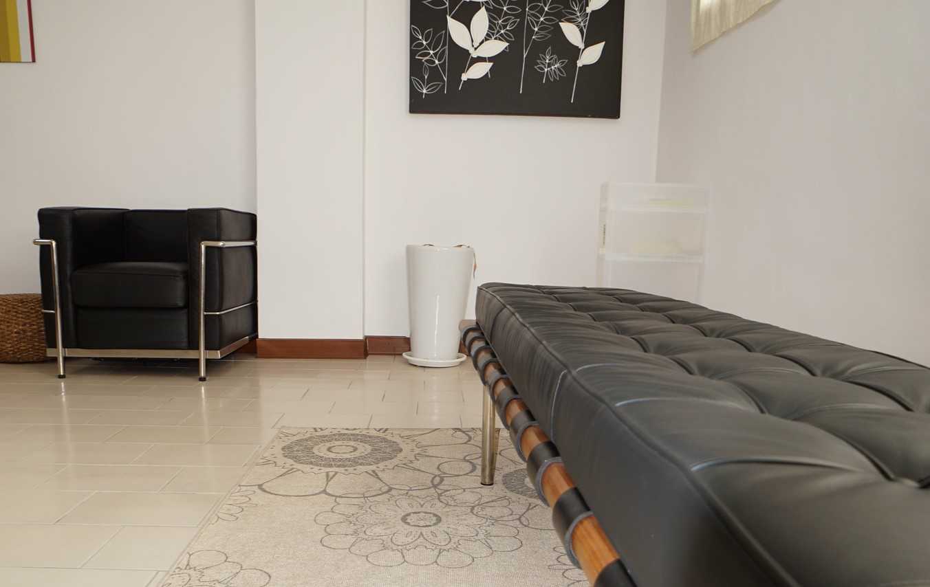 Черная кожаная кушетка гармонично сочетается с белыми стенами