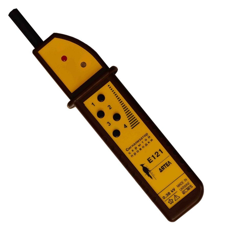 - Е121 «Дятел» – глубина мониторинга данного прибора 7 см, способен определить наличие электромагнитного поля и обнаружить разрыв провода.