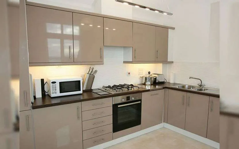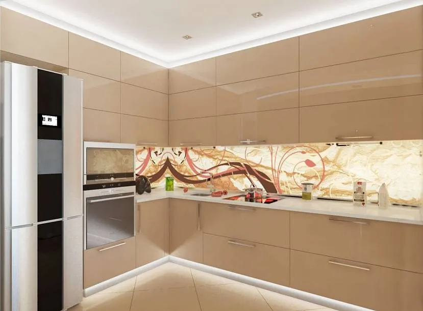 Особенно стоит обратить внимание на гарнитур бежевого цвета с глянцевыми фасадами. Свет будет отражаться от его поверхности, и в кухне станет светлее