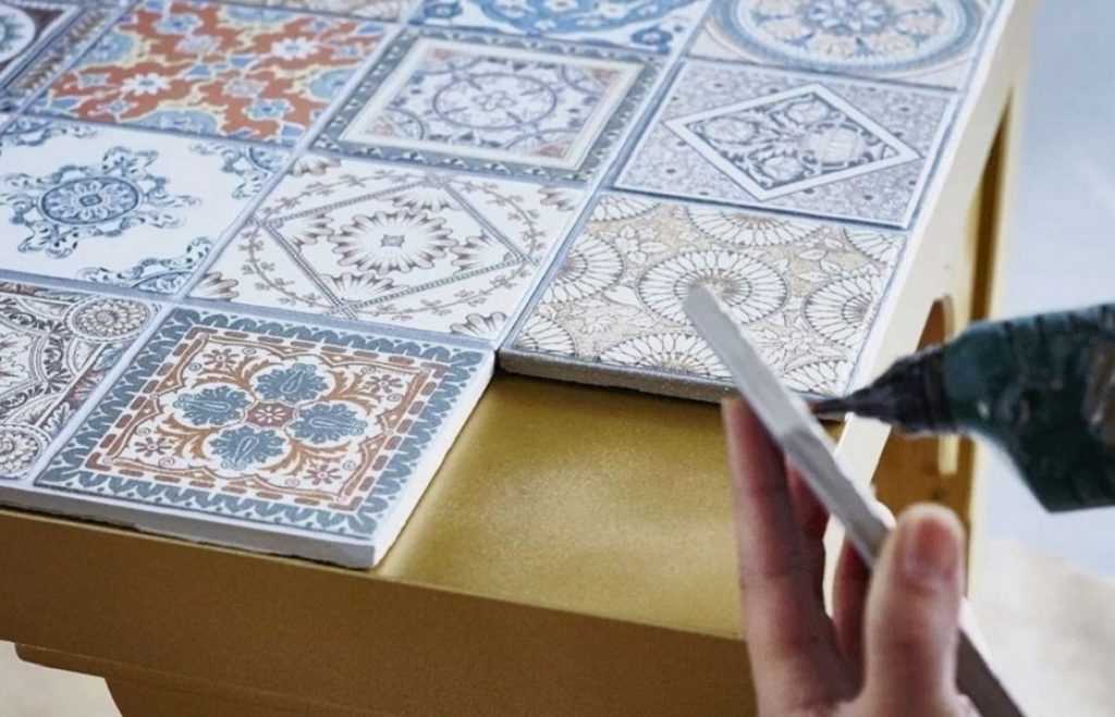 Можно украсить видавшую виды столешницу плиточными осколками. Для этого потребуется вырезать из древесины или фанеры основу, соответствующую размерам стола, и приклеить к ней узор из плитки. Мозаика может занимать всю площадь или формировать окантовку. После завершения работы нужно закрепить по контуру стола узкие декоративные полоски, которые продаются в любых строительных отделах.