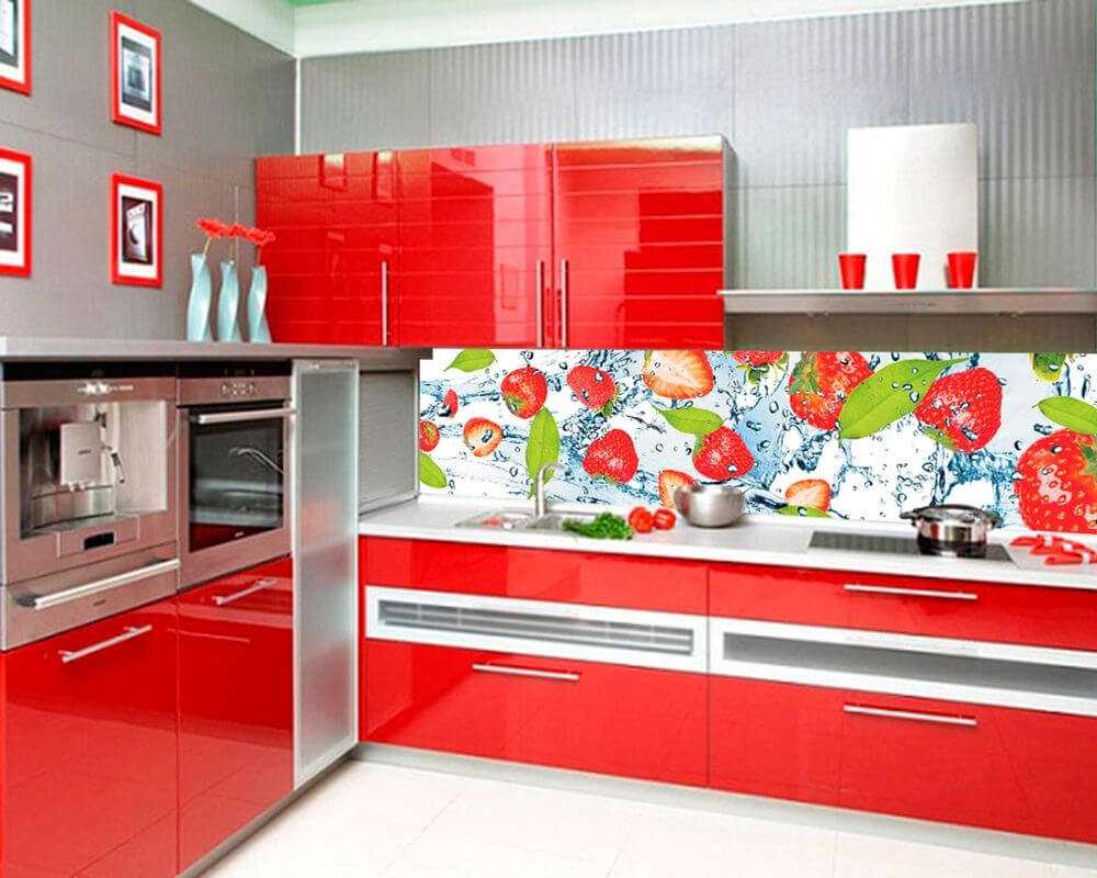 - Рисунок из ягод и фруктов. Они по душе многим людям, радуют глаз и поднимают настроение сочностью красок. Но остановить свой выбор именно на таком фрагменте стоит лишь в том случае, если стены кухни имеют нейтральный тон, а мебель – простые линии и формы без рисунков и яркой гаммы. В этом случае кухонный фартук с фруктами станет настоящим украшением. А вот с классической резной мебелью и цветными стенами (дверцами шкафов) хорошего сочетания не получится.