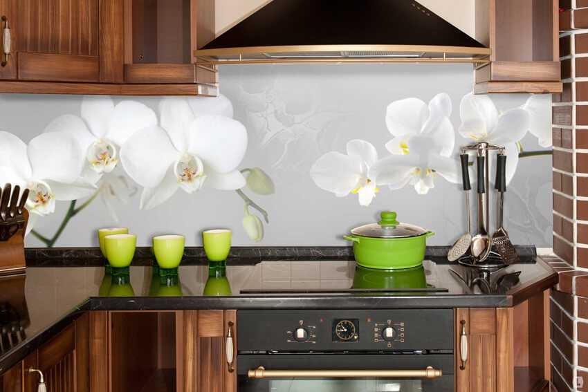 - Цветочный рисунок. Такое оформление, также как и в случае с фруктами, идеально будет смотреться при сочетании с нейтральным цветом стен и простой гладкой, ровной мебелью светлых тонов. Не стоит подбирать цветочный узор в тон общей расцветки кухни, поскольку в этом случае в интерьере не будет никакого акцента.