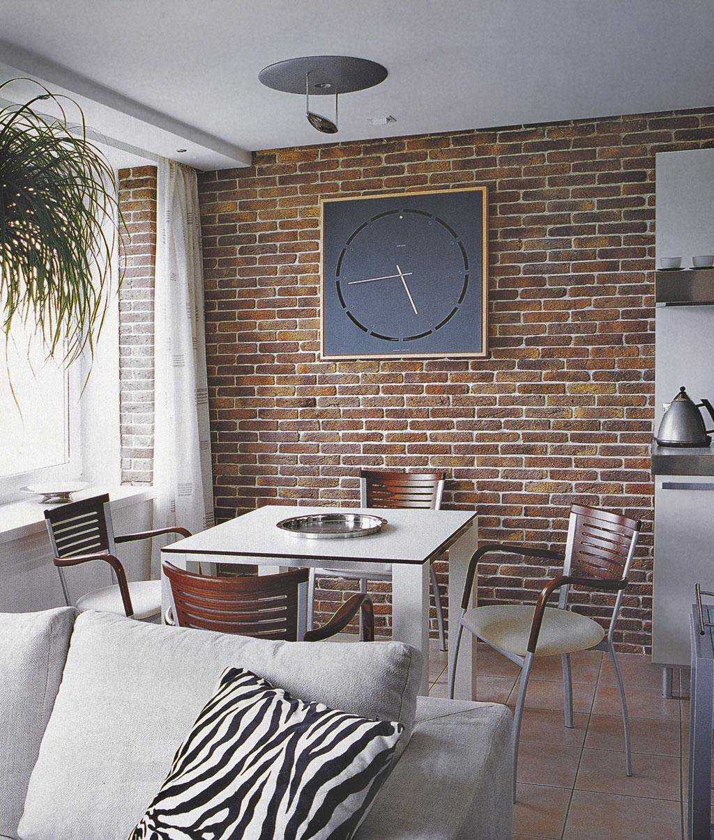 - В однокомнатных квартирах материалами, имитирующими кирпич, облицовывают одну стену, выбирая при этом мягкие неагрессивные тона. Такой вариант не перегружает интерьер.