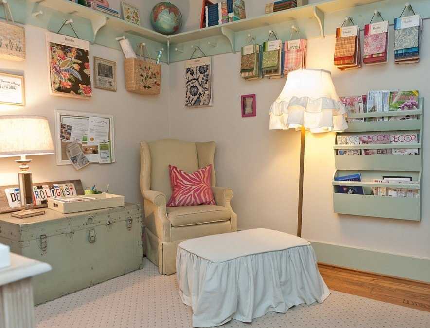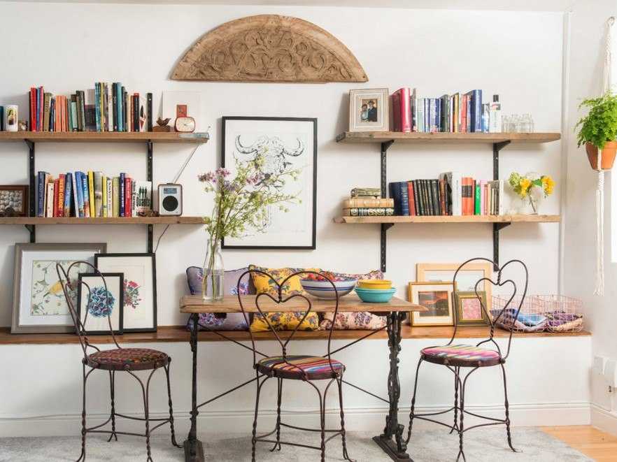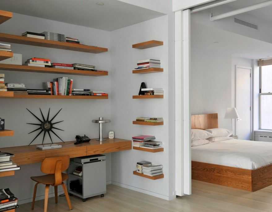 - Очень удобно закрыть пустующие стены различными конструкциями. Однако необходимо подобрать их в соответствии со стилем интерьера помещения и решить, какие предметы будут на них размещаться.