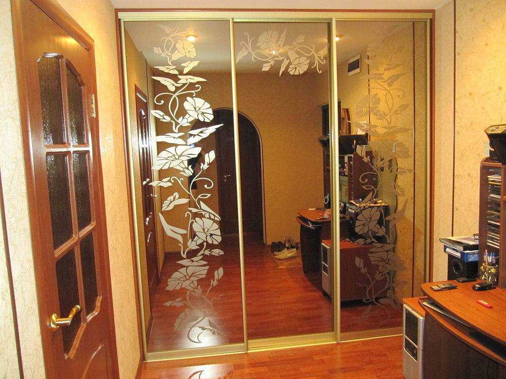 - Модели из стекла и зеркала. Если деревянные двери придают солидности и используются, как правило, в классических интерьерах, то главной функцией стеклянных и зеркальных раздвижных дверей в гардеробе становится визуальное расширение пространства. В раздвижных дверях используются прочные стекла. Рисунок на них наносится с помощью различных технологий. Это может быть пескоструйная обработка стекла, пленка или УФ-печать, заливной витраж. В отдельных случаях применяют даже технику фьюзинг (спеченное стекло). Классические виражи не используются ввиду их значительного веса и хрупкости;