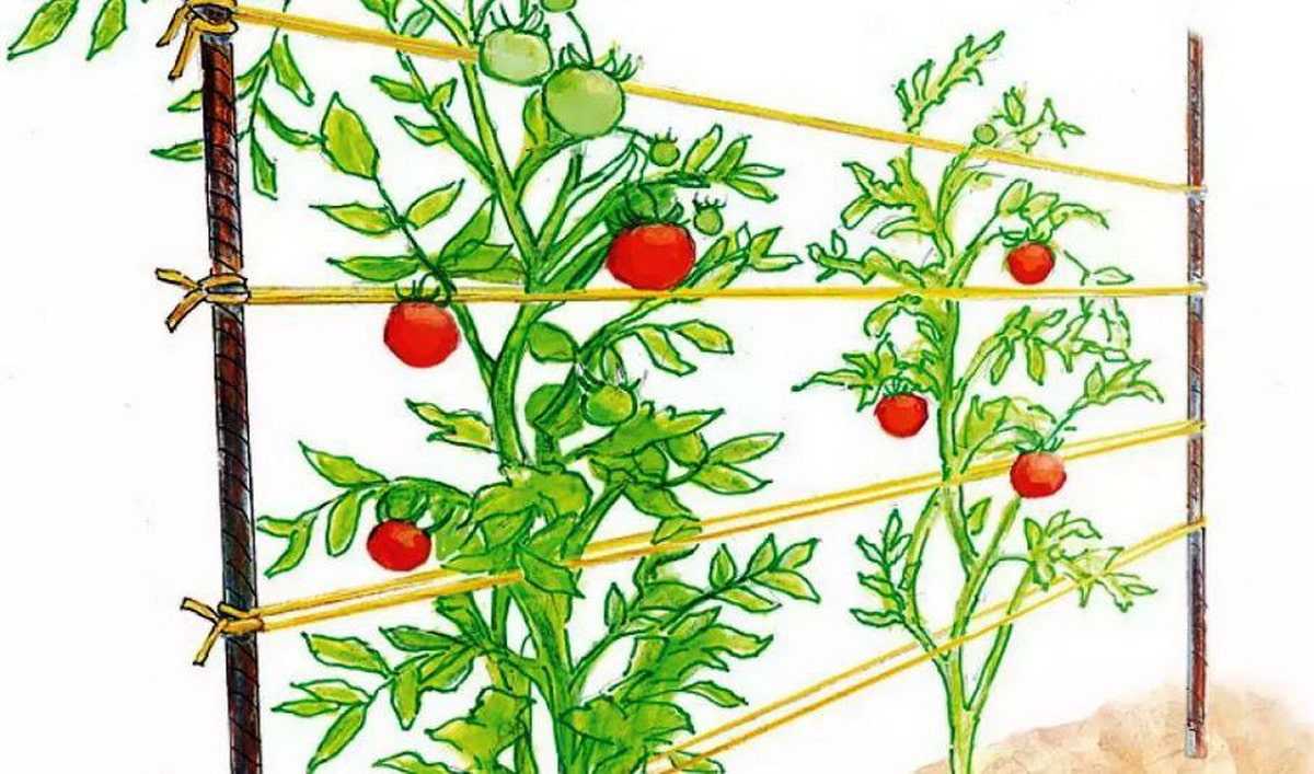 Кусты можно фиксировать линейно. Между кольями, забитыми в почву, устанавливается верхняя поперечина. К ней привязывают бечевку, нижний конец фиксируется к растению. Но нельзя делать сильное натяжение, томаты будут расти, и новые побеги обовьют ее.