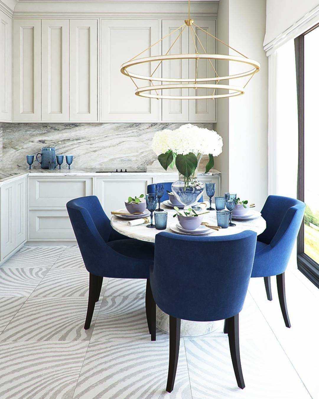 Бархат – изысканный вариант, который создаст на кухне атмосферу комфорта, уюта и одновременно шика. Этот материал сочетает в себе элегантный внешний вид и приятные тактильные свойства. При этом с помощью бархатных стульев можно добавить в кухню цветовой акцент. Выбирайте обивку насыщенных глубоких цветов с эффектным блеском – бирюзовый, малиновый, розовый, изумрудный или бордо.