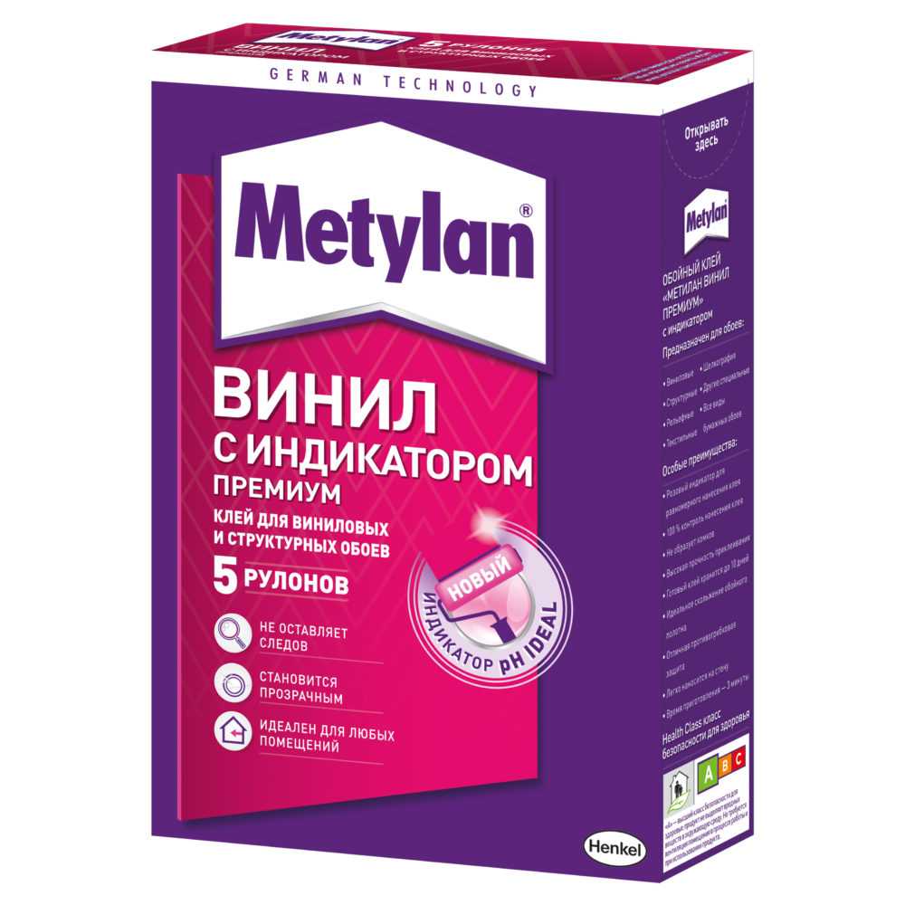 Metylan Винил Премиум с индикатором – это клей от уже упомянутого немецкого химического концерна Хенкель. Как понятно из названия, в комплект входит индикатор. Он представляет собой лакмусовую бумажку для измерения кислотно-щелочного баланса готового раствора, от которого зависит прочность наклеенного покрытия.