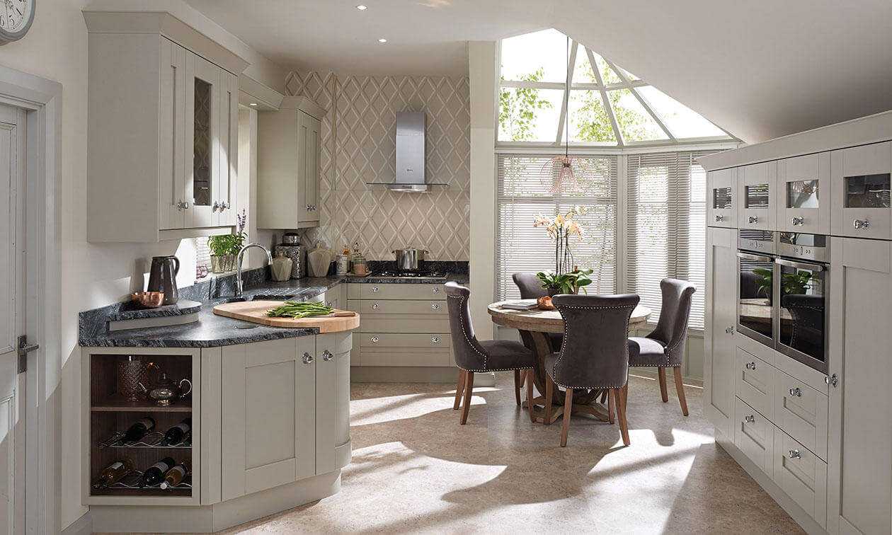 На фото г-образный гарнитур молочного оттенка с островным модулем.