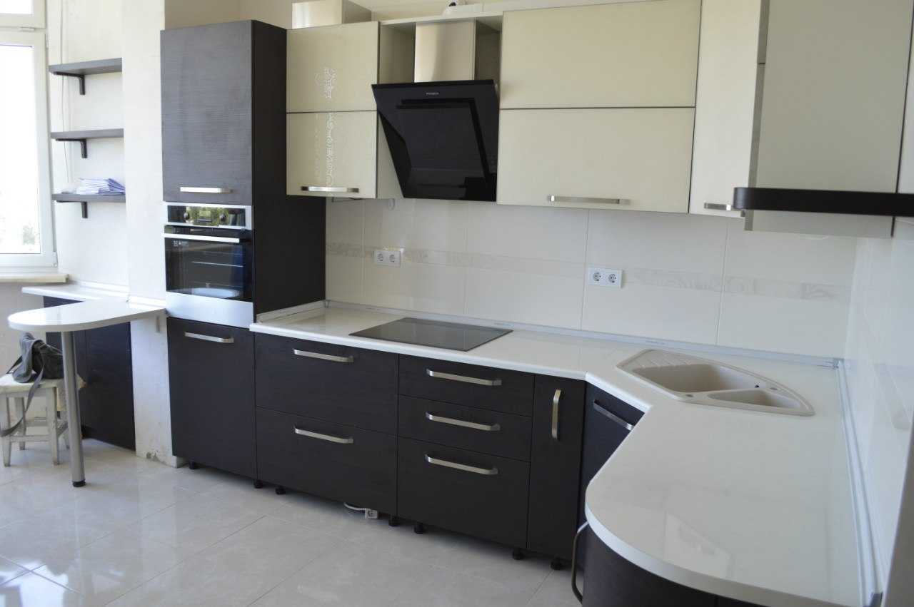 Контрастная светлая кухня с черной столешницей и угловой тумбой под мойкой